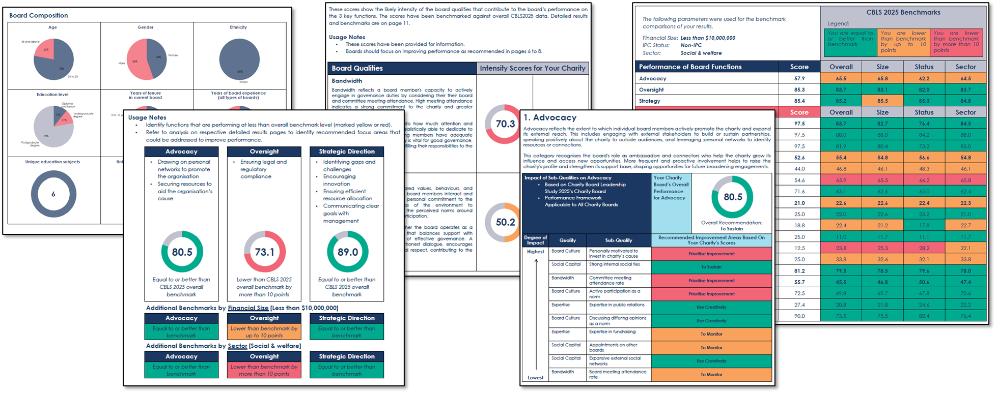 The results in the CNPL BoardPulse2.0 report are computed using the Charity Board Performance Framework and survey responses from individual board members. As such, the report provides a prediction of the board's performance rather than a 100% accurate evaluation. The report should be used as a starting point to drive discussion rather than an "examination" that the charity needs to excel in.