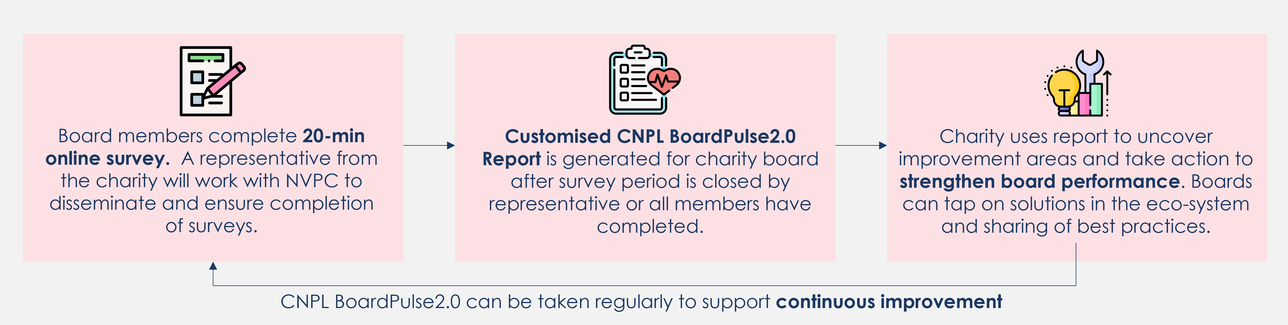 The process from registration to receiving your CNPL BoardPulse2.0 has been designed to be as straightforward as possible. From our experience, the step that takes the longest is the collection of completed individual survey responses from board members. To facilitate this, we have ensured that the survey can be completed within 20 minutes online using mobile devices. Charities can consider leveraging board meetings to further facilitate the completion of this step. Upon closing of the survey, NVPC will generate and provide the CNPL BoardPulse2.0 report within 5 working days.